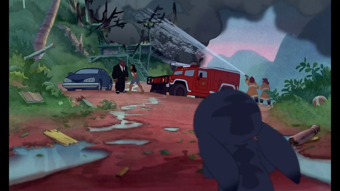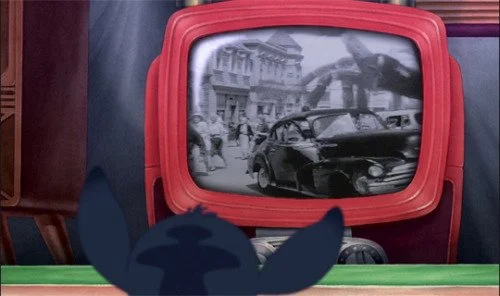 The scene of “LILO’S” house’s destruction was initially much darker, with “JUMBA” acting more sinister, using his gun all the time, forcing “STITCH” to fill the house with gas so that “JUMBA” couldn't use the gun, but he, apparently going completely insane, fires the gun anyway and the house explodes. The scene ends with “LILO” watching in horror as her house becomes a huge bonfire. The scene was heavily modified in the late production stages, with the gun barely used and made to look almost harmless even when it does (e.g., “STITCH catching the plasma shot). It was also heavily laden with jokes and goofs, including “blue punch buggy”, “I love that song”, “Leave my MOTHER out of this”, “Happy HANUKKAH” dialog, exploding doll, etc. The new scene ends with “LILO” looking back in horror, as before, but the view of the burning house is completely cut.