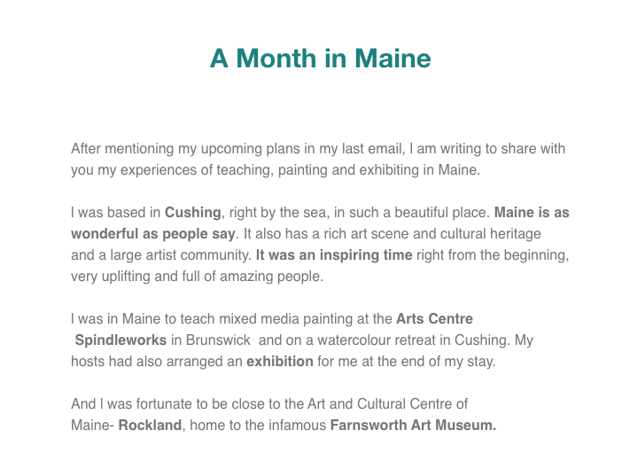 Annabel, a British artist living in Spain, traveled to Maine to paint, observe and connect with community. Working together, artists were encouraged to expand their current skills such as mixing rich colors, layering diverse textures, and exploring the application of paint glazes. Focusing on explorative techniques, artists were supported in going deeper into their creative practices.